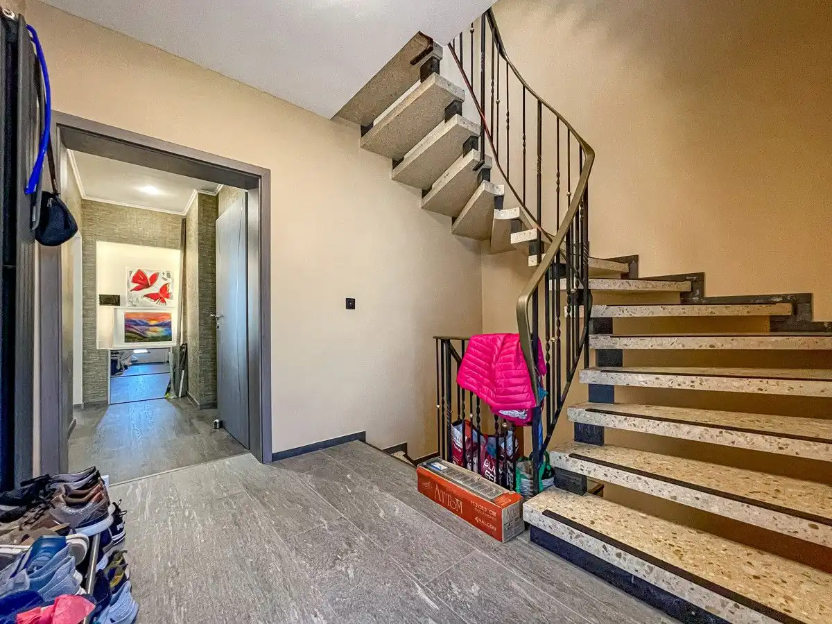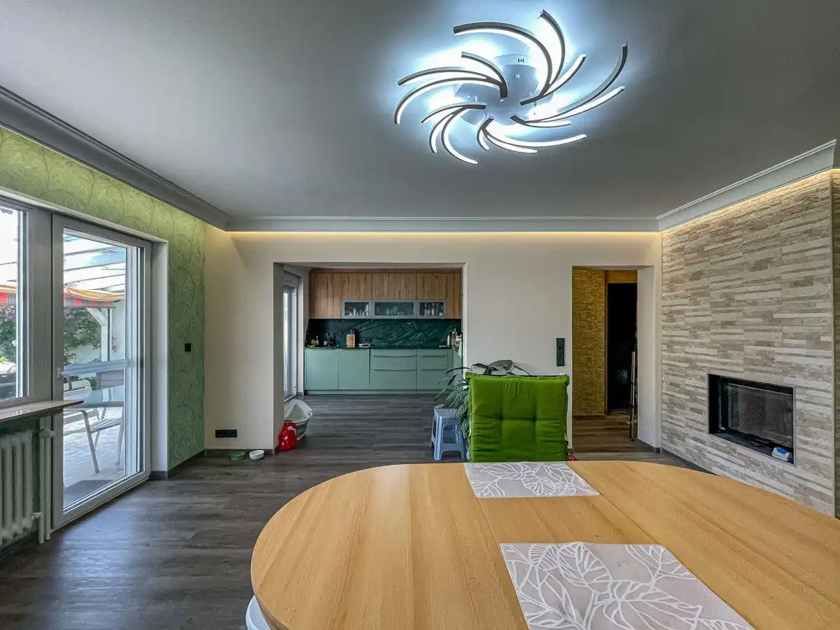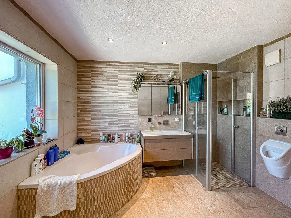 - Sols : carrelage et vinyle - Fenêtres isolantes en plastique et en bois (double vitrage) - 2 cuisines équipées - 3 salles de bain - Hammam - Balcon - Cheminée de chauffage - Chauffage au sol dans toutes les salles de bains - Terrasse couverte sud - abri de jardin - garage attenant à la maison - chauffage central au fioul de 2003 Modernisation - Revêtements de sol 2021 - Portes intérieures 2021 - Porte d'entrée 2021 - Salle de bains: rez-de-chaussée, étage, sous les combles 2021 - Conduites d'eau en acier inoxydable de 2021 - Électricité 2021 - Porte de terrasse RDC 2021 - Terrasse couverte 2021 - Cuisines intégrées RDC et combles 2021 - Fenêtres double vitrage avec cadre PVC (double vitrage) de 2006